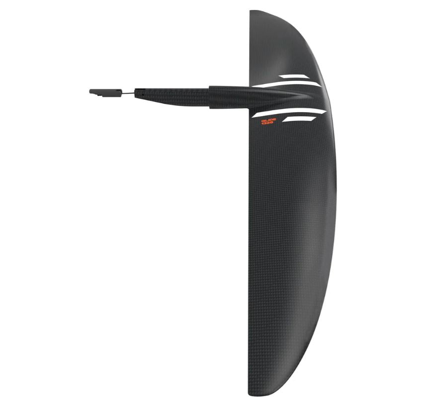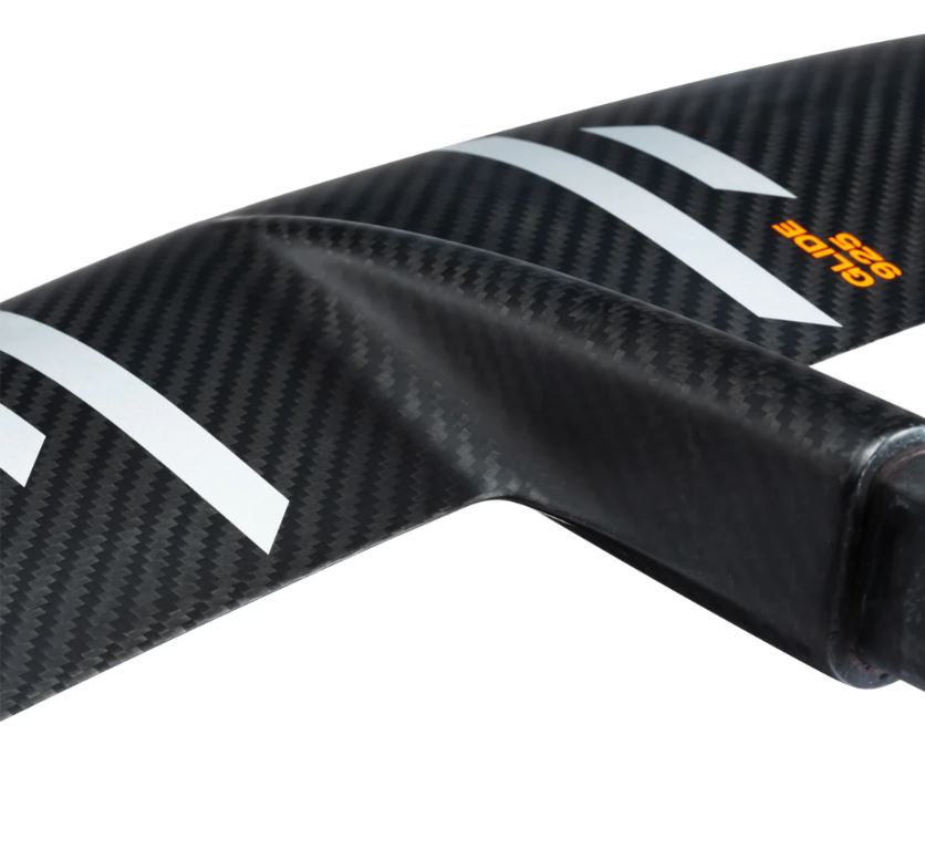The Flow front wings are designed to enhance maneuverability and efficiency, pushing performance to new levels. With a high aspect ratio, these wings are highly efficient, offering a speed range that bridges the Glide 925's low end and the Glide 725's high end, providing optimal performance across various conditions. The tapered, blended profile reduces drag at lower speeds, while the closer mast mounting and tapered wing tips boost reactivity, counteracting the larger span.