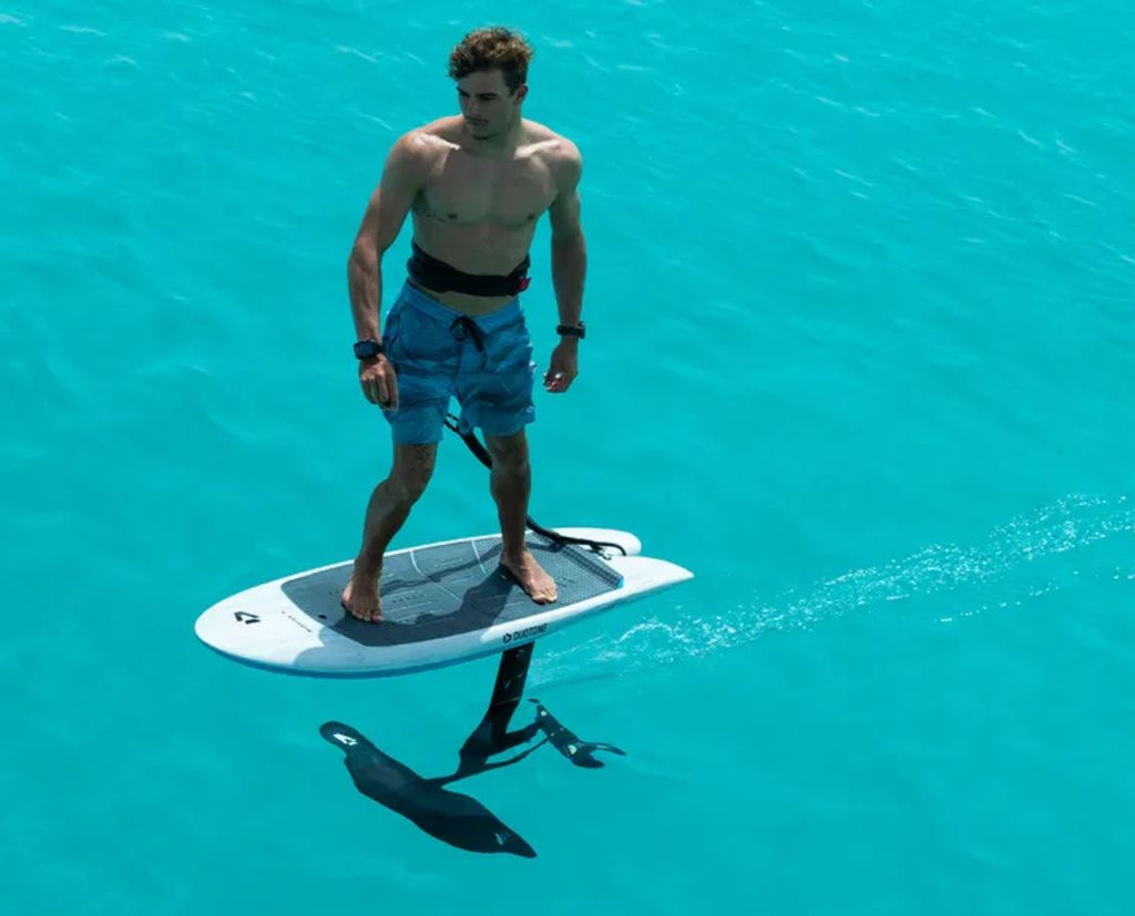 The Foil Assist is powered by two compact batteries housed in a waterproof box mounted on a lightweight eHarness (approx. 3.76 kg). This keeps your board free from extra weight and drag. With the batteries placed on your hips, the natural, fluid feel of foiling is preserved while still giving you full freedom of movement. The eHarness is buoyant and easy to remove. A cable runs neatly along the shorter board leash and connects the batteries to the eMast. The receiver integrated into the battery box ensures a stable and reliable connection between the remote and the motor throughout your entire session.